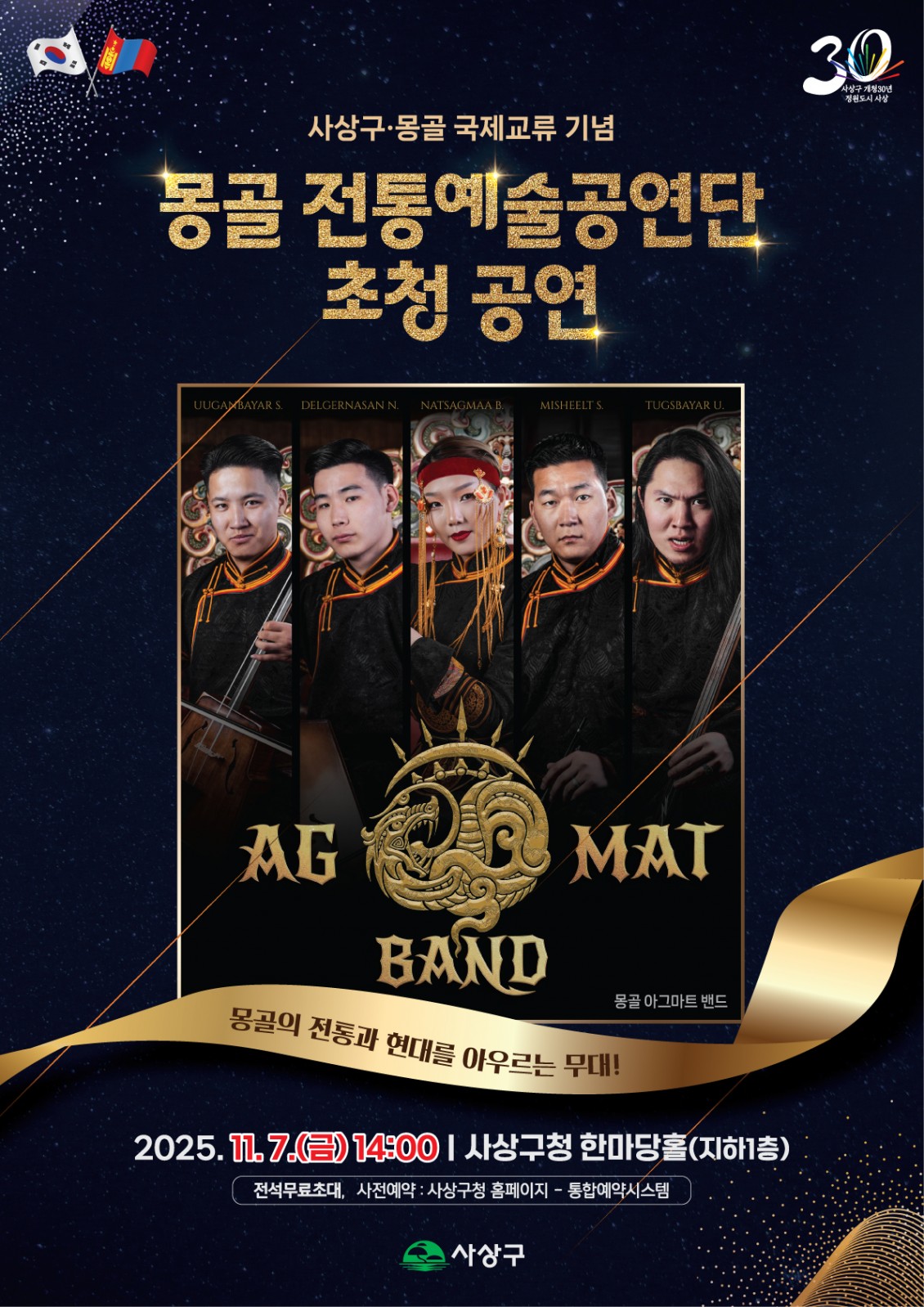 몽골 전통예술공연단 초청 공연 사상문화원 0 111 11.03 11:32 * 사상구, 몽골 국제 교류 기념 <몽골 전통예술 공연단 초청 공연>* 일시 : 2025년 11월 7일 14:00* 장소 : 사상구청 한마당홀 (지하 1층)* 입장료 : 전석 무료 (사상구청 홈페이지 사전예약)